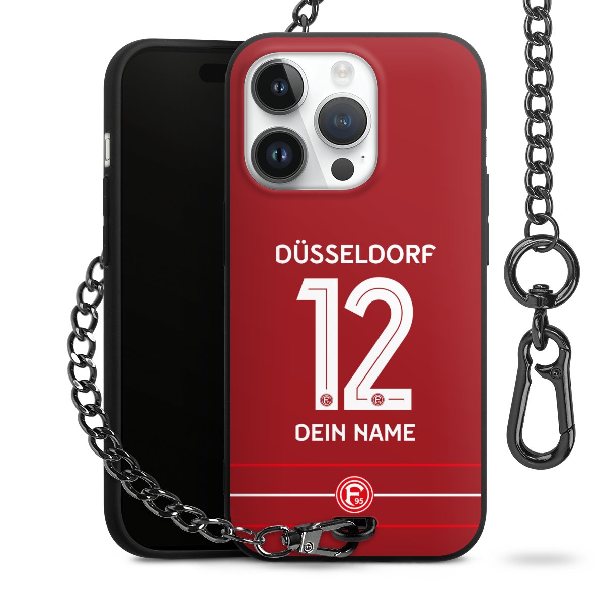 Die Handyhülle verfügt über eine mittig am unteren Rand platzierte Öse, an der die Metallkette stabil befestigt ist. Bestelle die Hülle einfach für Dein Smartphone-Modell, dann passt sie wie angegossen und Du brauchst sie bloß einmal anzudrücken. Handy in die Tasche, Karabiner an den Hosenbund – schon kann die Party starten.