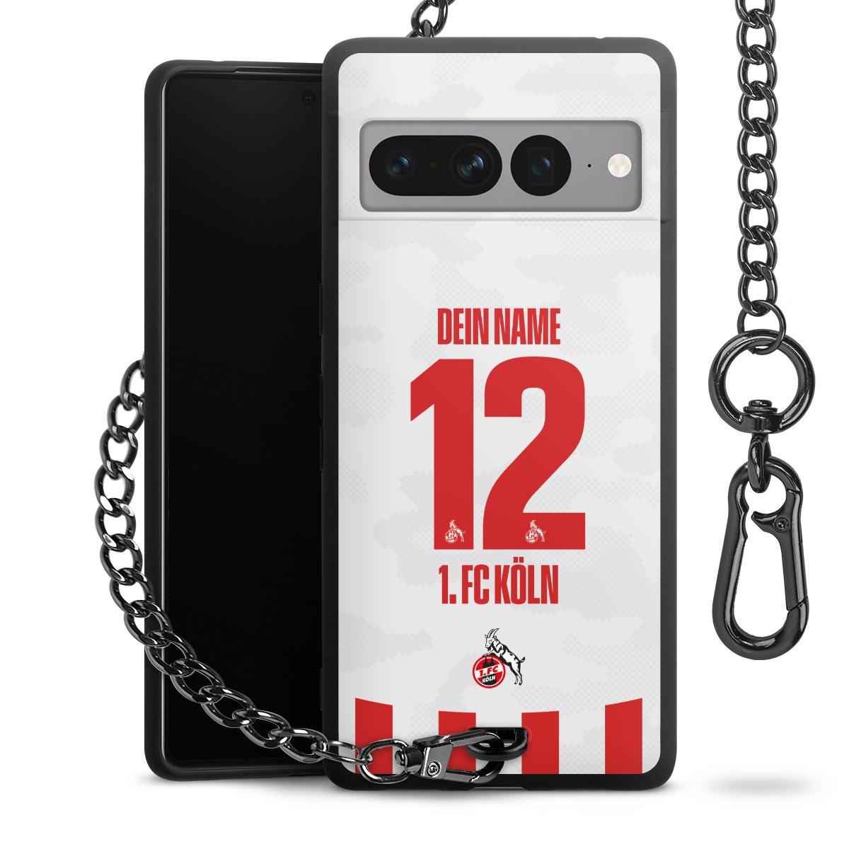 Die Handyhülle verfügt über eine mittig am unteren Rand platzierte Öse, an der die Metallkette stabil befestigt ist. Bestelle die Hülle einfach für Dein Smartphone-Modell, dann passt sie wie angegossen und Du brauchst sie bloß einmal anzudrücken. Handy in die Tasche, Karabiner an den Hosenbund – schon kann die Party starten.