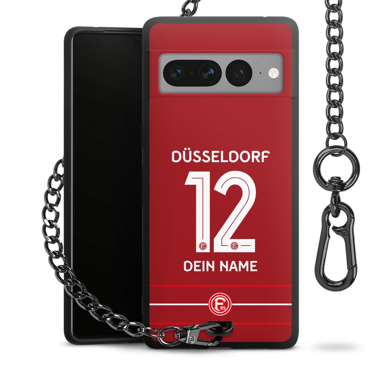 Die Handyhülle verfügt über eine mittig am unteren Rand platzierte Öse, an der die Metallkette stabil befestigt ist. Bestelle die Hülle einfach für Dein Smartphone-Modell, dann passt sie wie angegossen und Du brauchst sie bloß einmal anzudrücken. Handy in die Tasche, Karabiner an den Hosenbund – schon kann die Party starten.