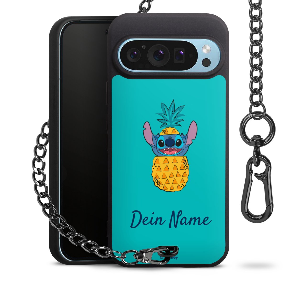 Die Handyhülle verfügt über eine mittig am unteren Rand platzierte Öse, an der die Metallkette stabil befestigt ist. Bestelle die Hülle einfach für Dein Smartphone-Modell, dann passt sie wie angegossen und Du brauchst sie bloß einmal anzudrücken. Handy in die Tasche, Karabiner an den Hosenbund – schon kann die Party starten.