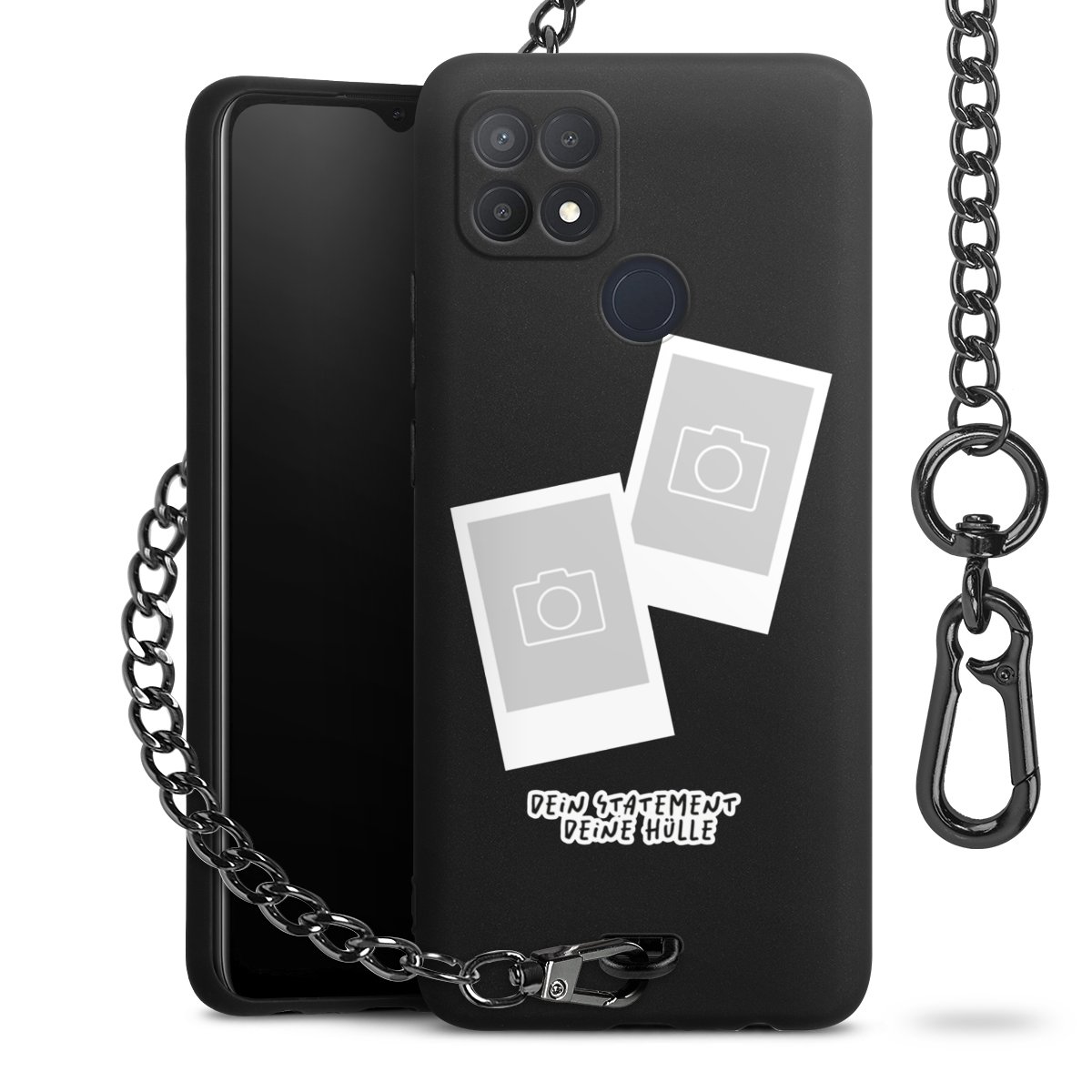 Die mattschwarze Silikon-Handyhülle besteht aus robustem TPU (thermoplastisches Polyurethan). Sie ist flexibel und schützt Dein Smartphone vor Stößen und Kratzern. Die Kette sowie der Karabinerhaken sind aus Metall in Gunmetal-Optik gefertigt. Für dieses Produkt kommen ausschließlich TÜV-geprüfte Materialien zum Einsatz.