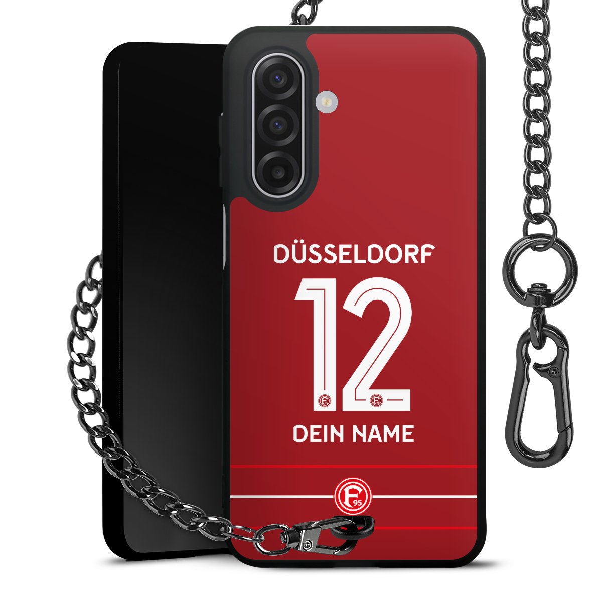 Die Handyhülle verfügt über eine mittig am unteren Rand platzierte Öse, an der die Metallkette stabil befestigt ist. Bestelle die Hülle einfach für Dein Smartphone-Modell, dann passt sie wie angegossen und Du brauchst sie bloß einmal anzudrücken. Handy in die Tasche, Karabiner an den Hosenbund – schon kann die Party starten.