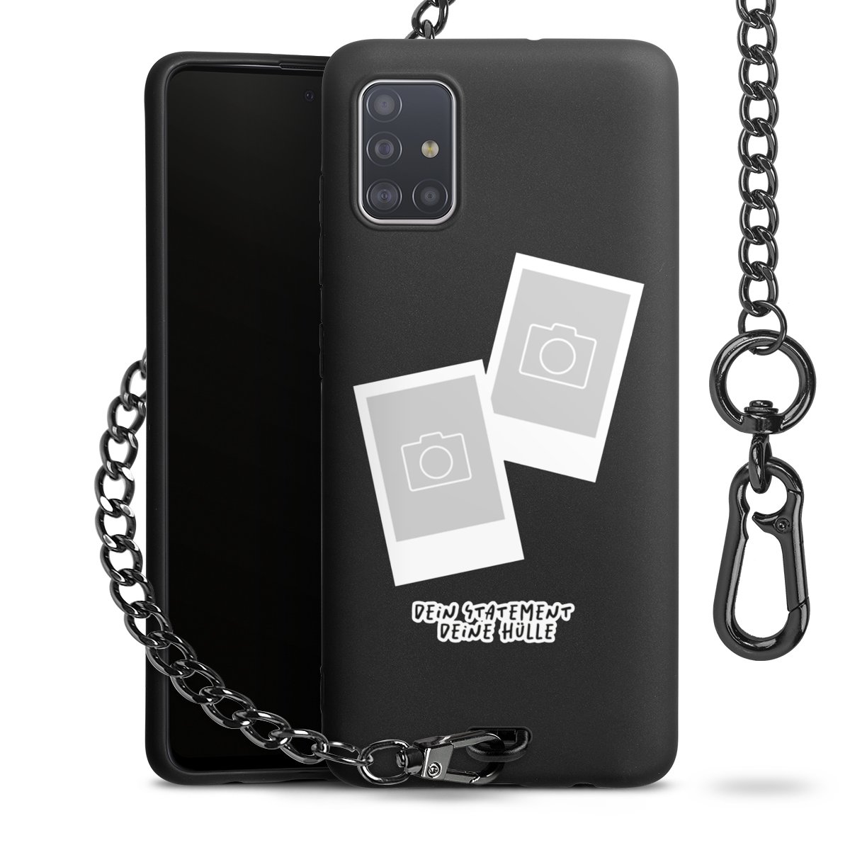Die mattschwarze Silikon-Handyhülle besteht aus robustem TPU (thermoplastisches Polyurethan). Sie ist flexibel und schützt Dein Smartphone vor Stößen und Kratzern. Die Kette sowie der Karabinerhaken sind aus Metall in Gunmetal-Optik gefertigt. Für dieses Produkt kommen ausschließlich TÜV-geprüfte Materialien zum Einsatz.