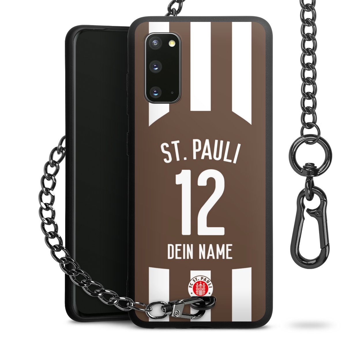 Die Handyhülle verfügt über eine mittig am unteren Rand platzierte Öse, an der die Metallkette stabil befestigt ist. Bestelle die Hülle einfach für Dein Smartphone-Modell, dann passt sie wie angegossen und Du brauchst sie bloß einmal anzudrücken. Handy in die Tasche, Karabiner an den Hosenbund – schon kann die Party starten.