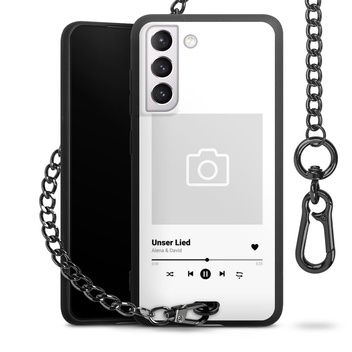 Die mattschwarze Silikon-Handyhülle besteht aus robustem TPU (thermoplastisches Polyurethan). Sie ist flexibel und schützt Dein Smartphone vor Stößen und Kratzern. Die Kette sowie der Karabinerhaken sind aus Metall in Gunmetal-Optik gefertigt. Für dieses Produkt kommen ausschließlich TÜV-geprüfte Materialien zum Einsatz.
