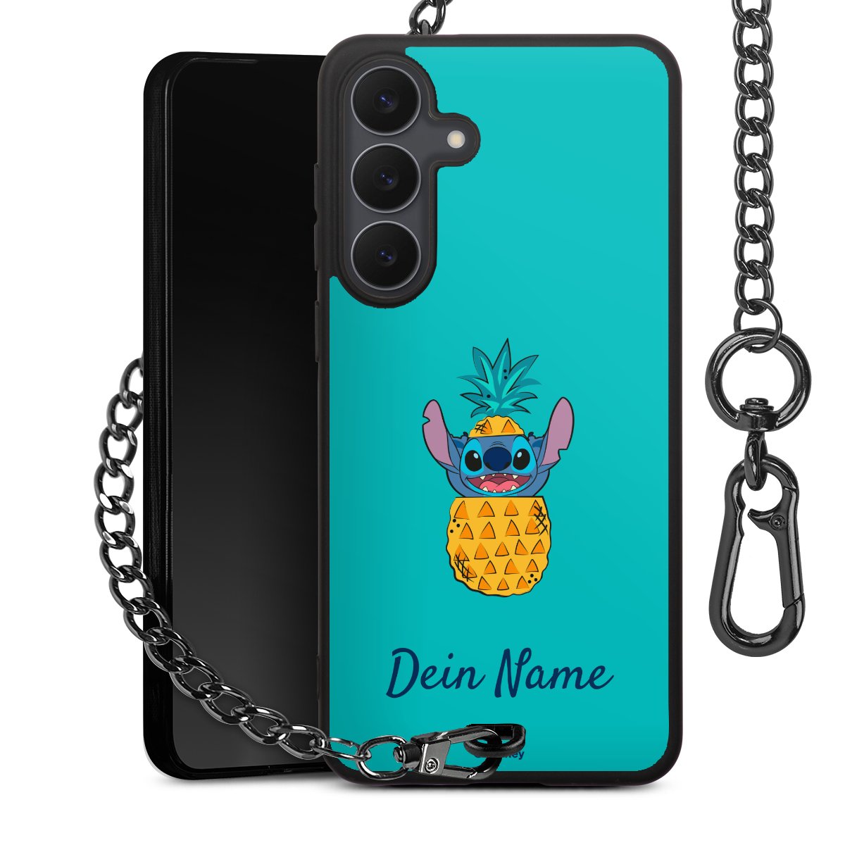Die Handyhülle verfügt über eine mittig am unteren Rand platzierte Öse, an der die Metallkette stabil befestigt ist. Bestelle die Hülle einfach für Dein Smartphone-Modell, dann passt sie wie angegossen und Du brauchst sie bloß einmal anzudrücken. Handy in die Tasche, Karabiner an den Hosenbund – schon kann die Party starten.