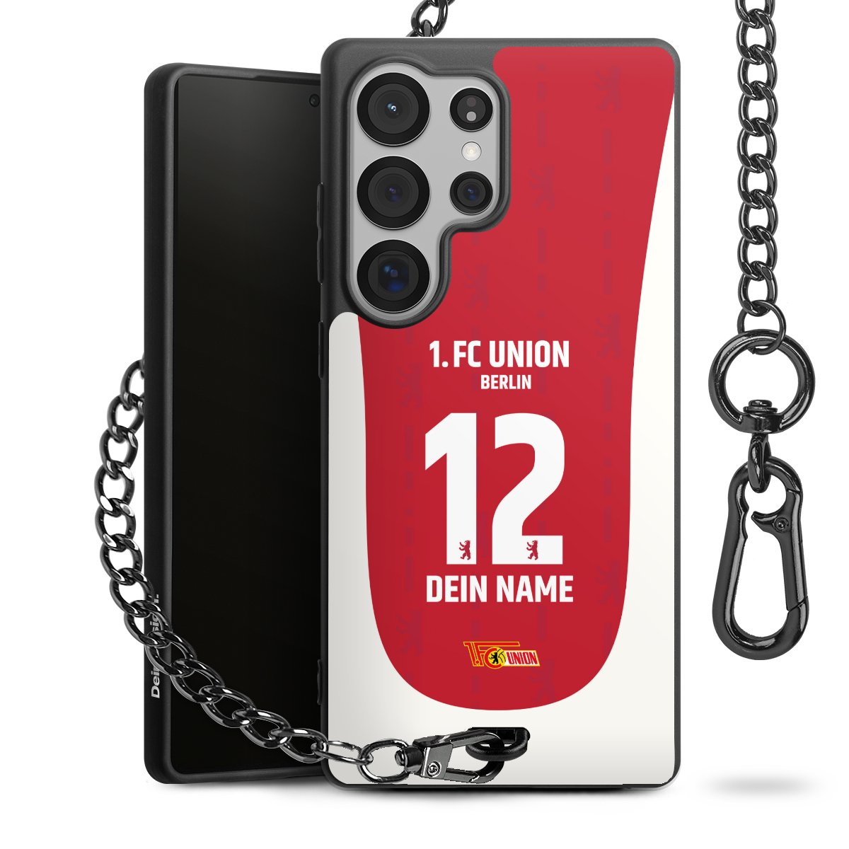 Die Handyhülle verfügt über eine mittig am unteren Rand platzierte Öse, an der die Metallkette stabil befestigt ist. Bestelle die Hülle einfach für Dein Smartphone-Modell, dann passt sie wie angegossen und Du brauchst sie bloß einmal anzudrücken. Handy in die Tasche, Karabiner an den Hosenbund – schon kann die Party starten.