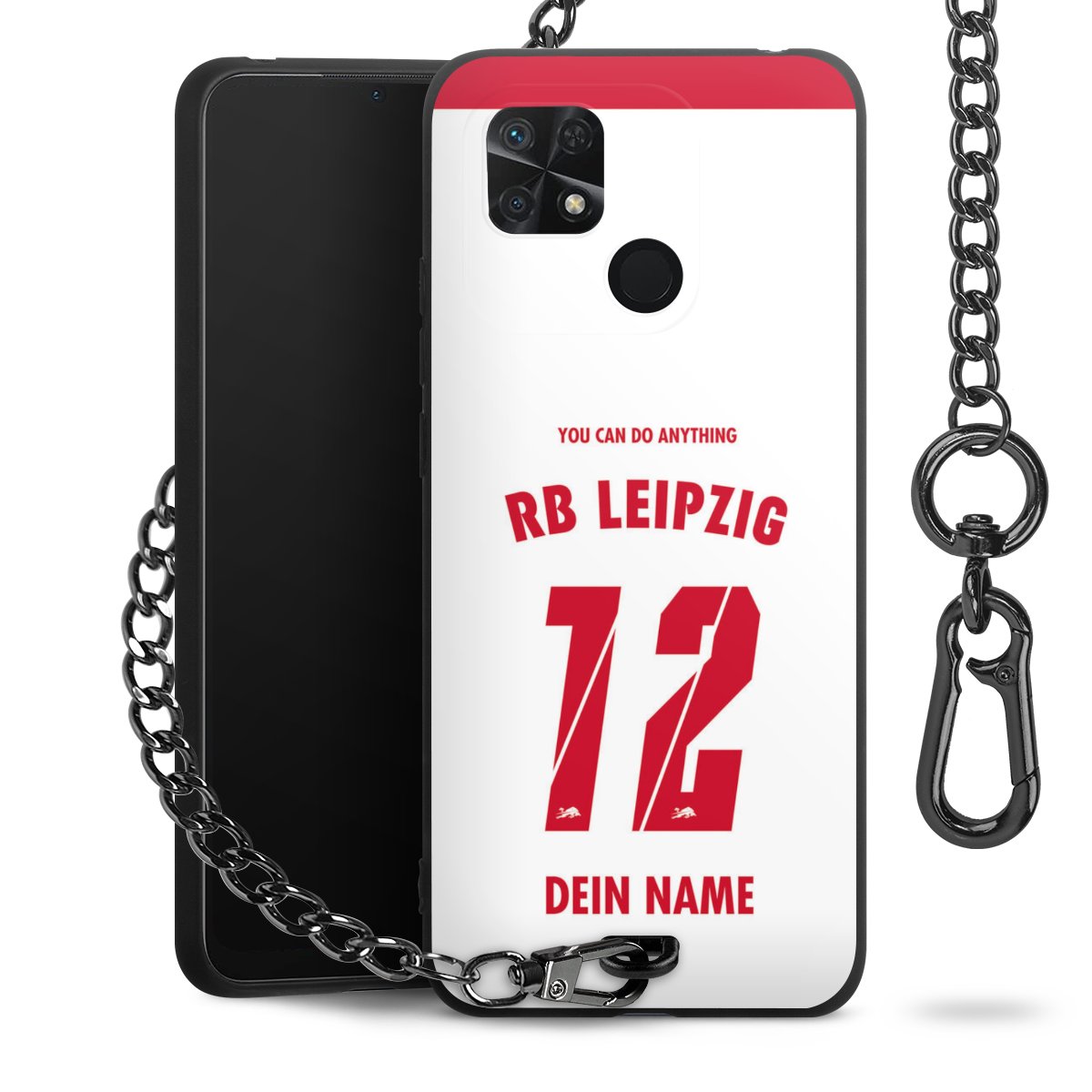 Die Handyhülle verfügt über eine mittig am unteren Rand platzierte Öse, an der die Metallkette stabil befestigt ist. Bestelle die Hülle einfach für Dein Smartphone-Modell, dann passt sie wie angegossen und Du brauchst sie bloß einmal anzudrücken. Handy in die Tasche, Karabiner an den Hosenbund – schon kann die Party starten.