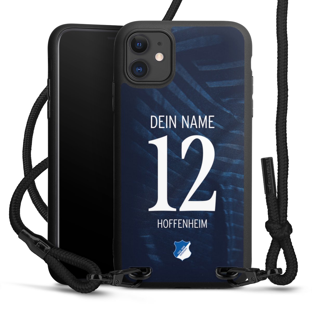 Pure Black: Handyhülle, Stoffband und Metalldetails in stylischem Mattschwarz.