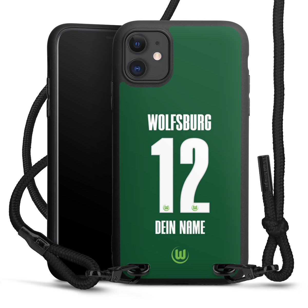 Pure Black: Handyhülle, Stoffband und Metalldetails in stylischem Mattschwarz.