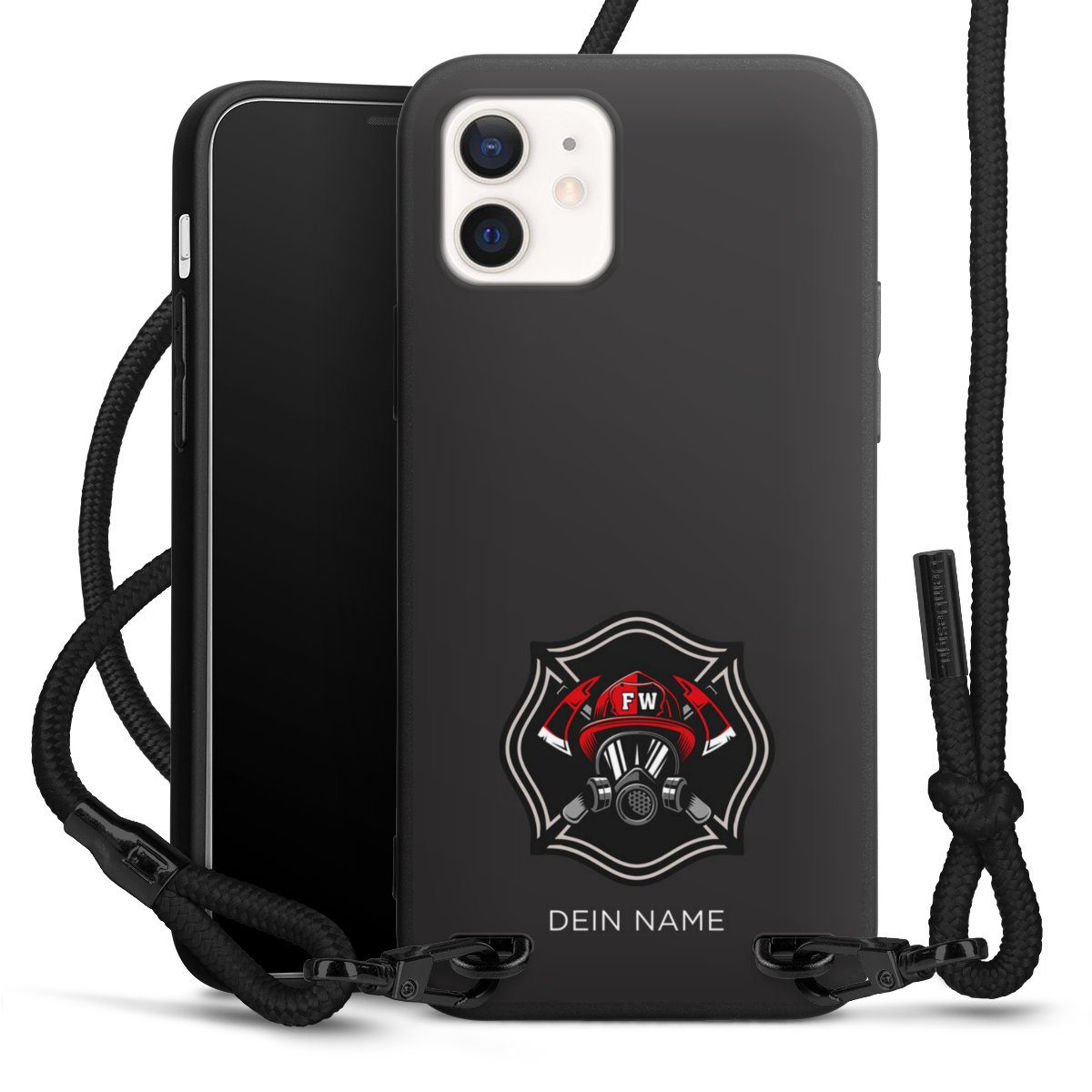 Pure Black: Handyhülle, Stoffband und Metalldetails in stylischem Mattschwarz.