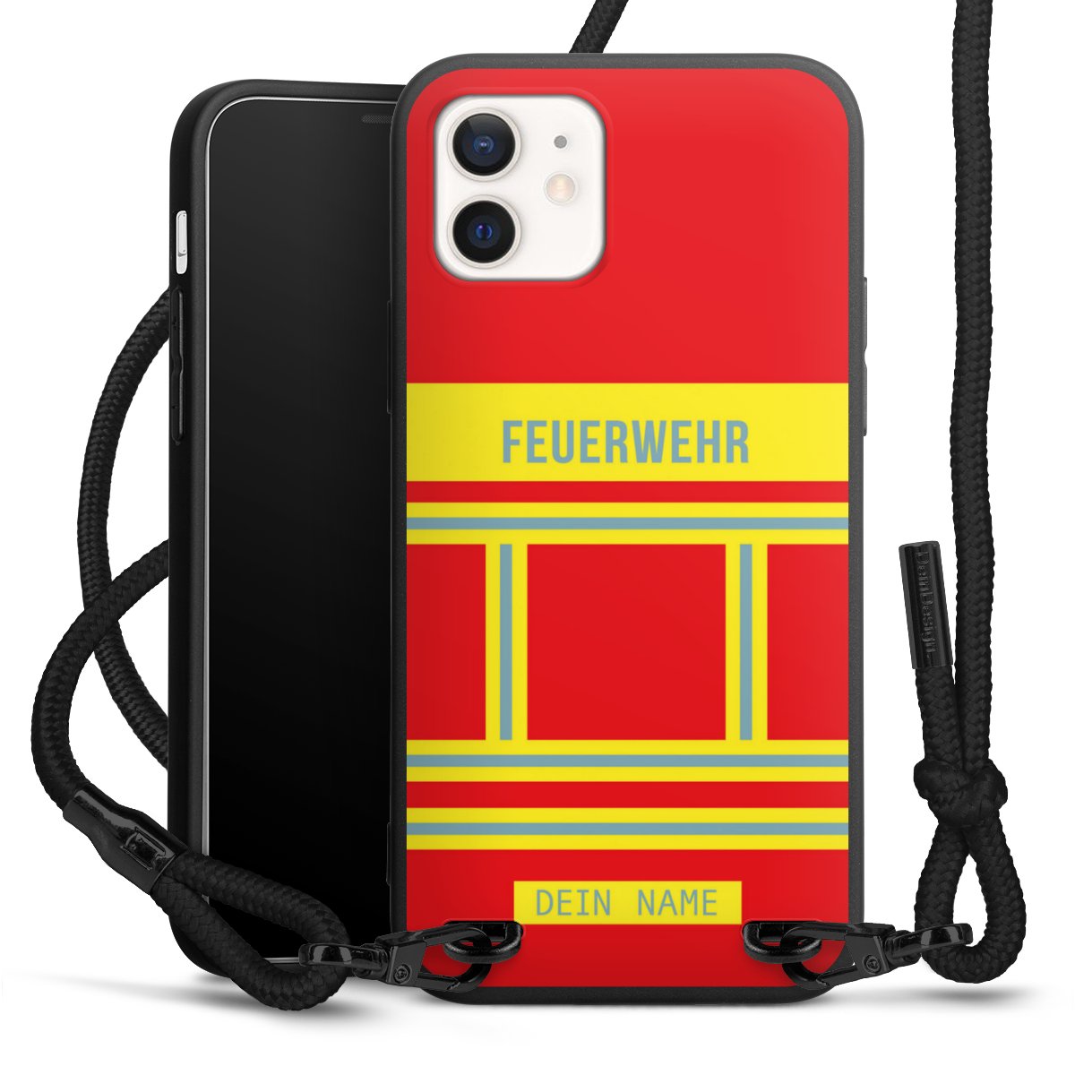 Pure Black: Handyhülle, Stoffband und Metalldetails in stylischem Mattschwarz.