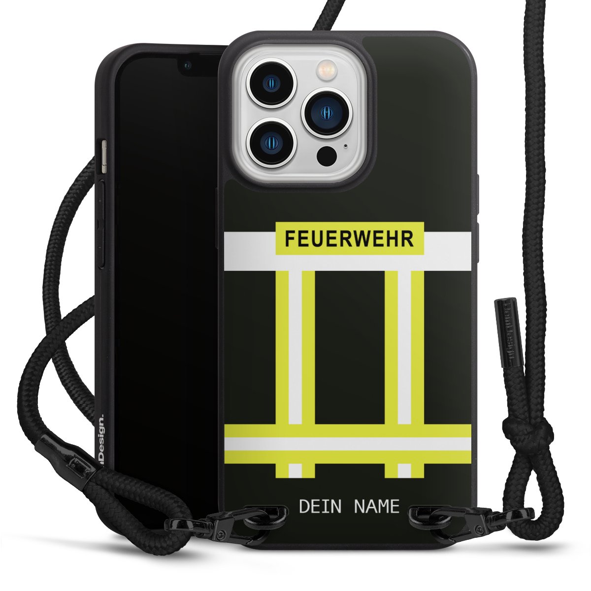 Pure Black: Handyhülle, Stoffband und Metalldetails in stylischem Mattschwarz.