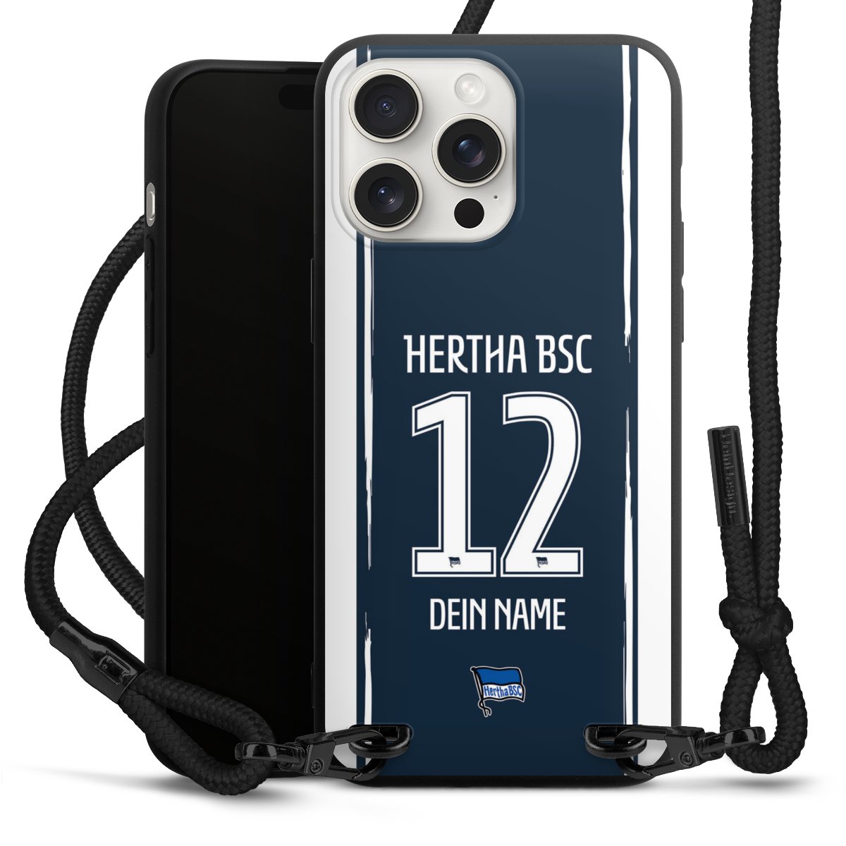 Pure Black: Handyhülle, Stoffband und Metalldetails in stylischem Mattschwarz.