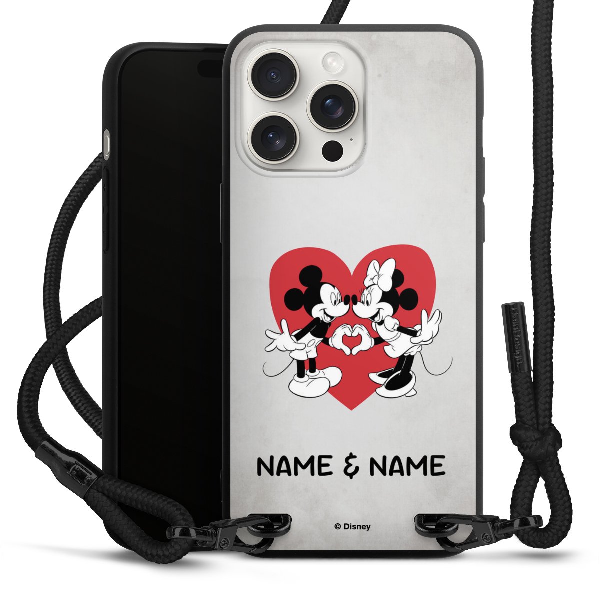 Pure Black: Handyhülle, Stoffband und Metalldetails in stylischem Mattschwarz.