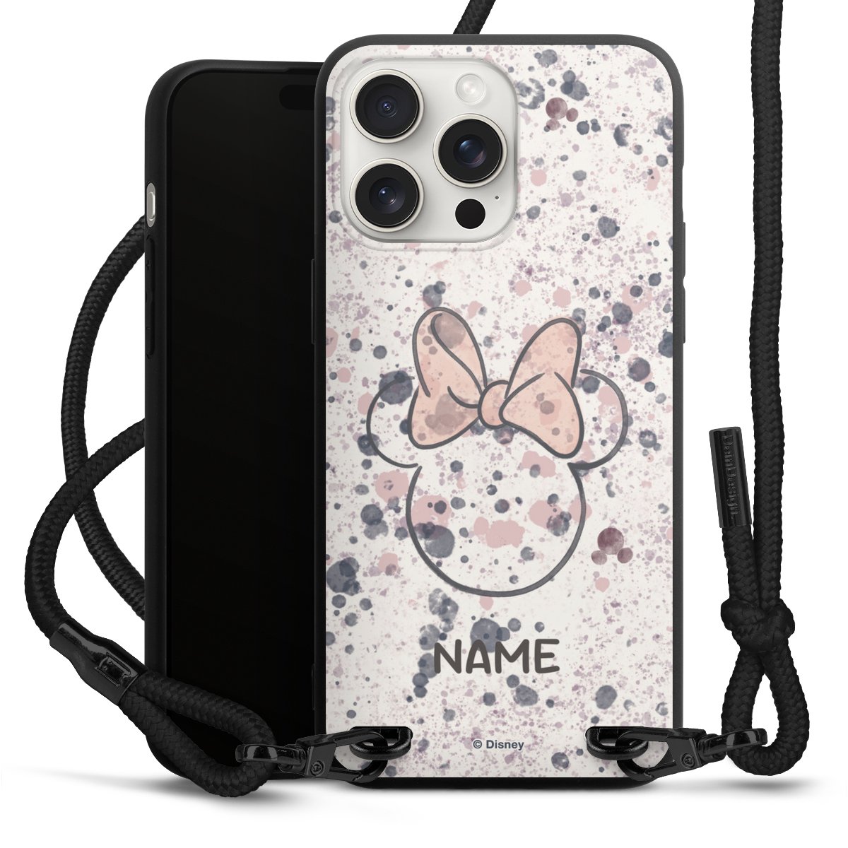 Pure Black: Handyhülle, Stoffband und Metalldetails in stylischem Mattschwarz.