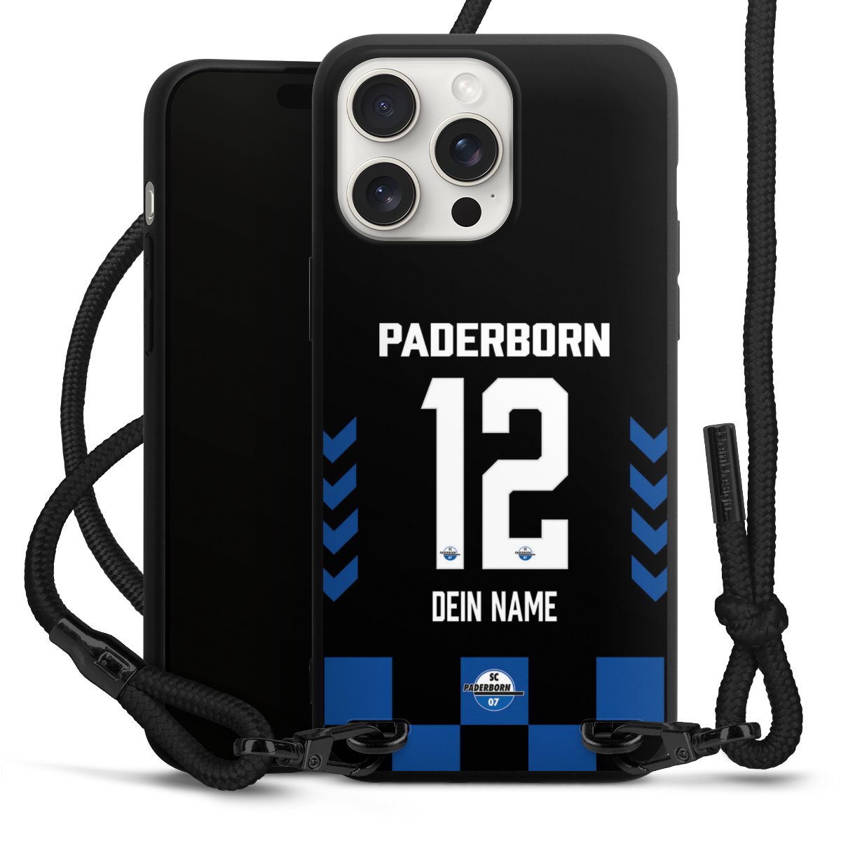 Pure Black: Handyhülle, Stoffband und Metalldetails in stylischem Mattschwarz.