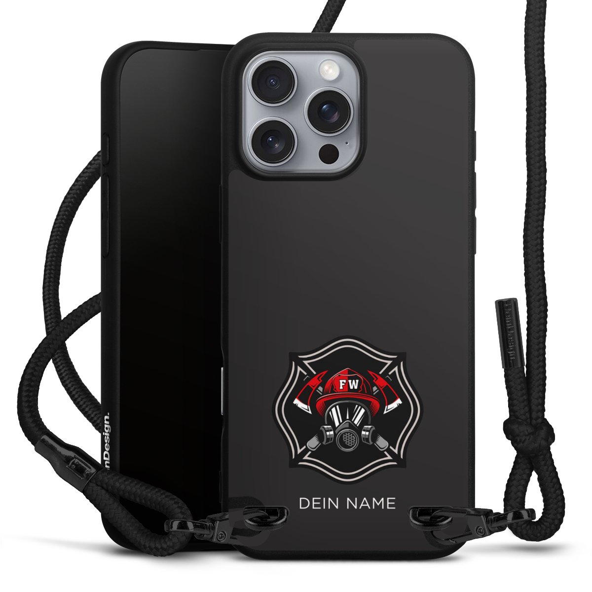 Pure Black: Handyhülle, Stoffband und Metalldetails in stylischem Mattschwarz.
