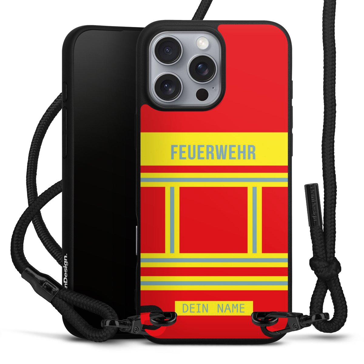 Pure Black: Handyhülle, Stoffband und Metalldetails in stylischem Mattschwarz.