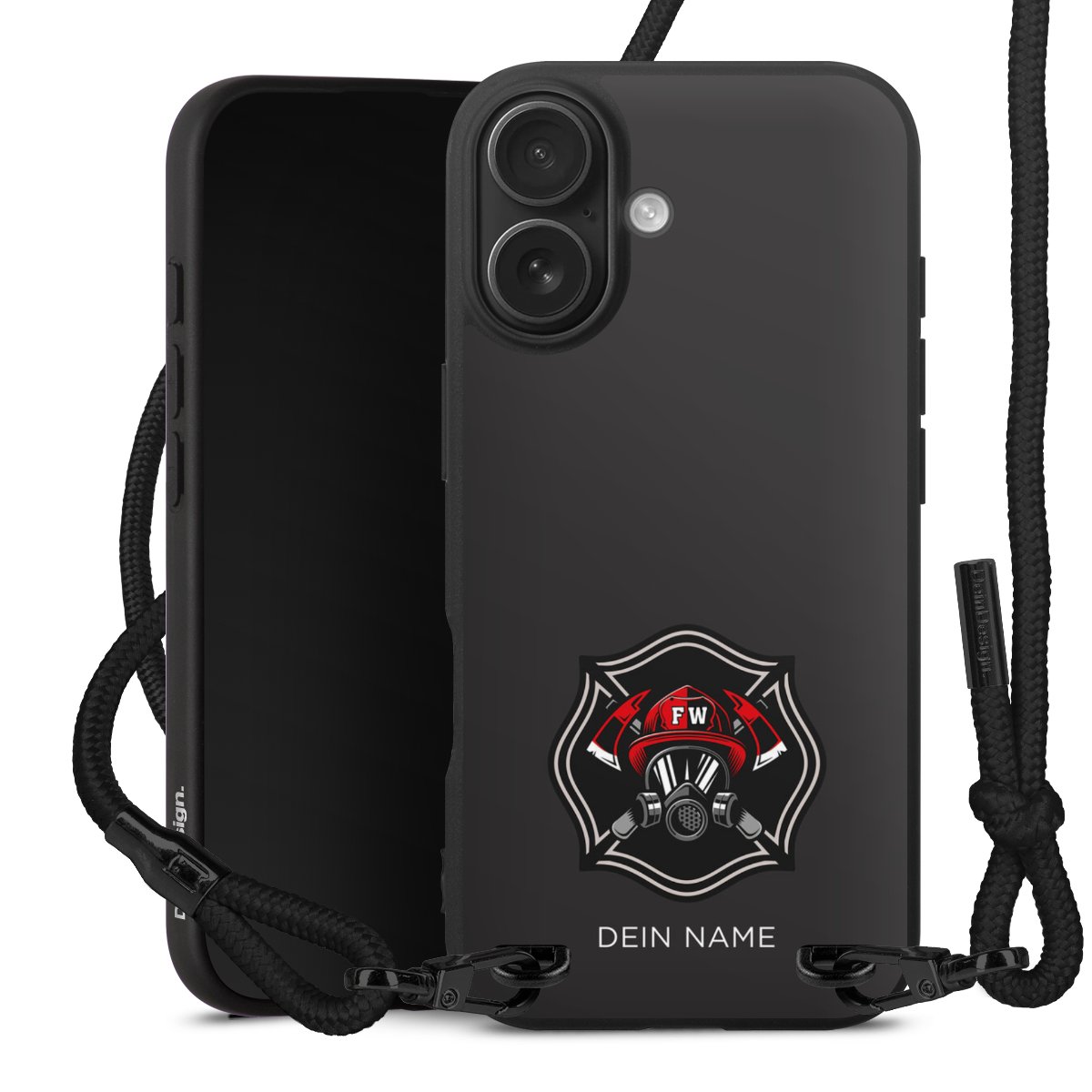 Pure Black: Handyhülle, Stoffband und Metalldetails in stylischem Mattschwarz.