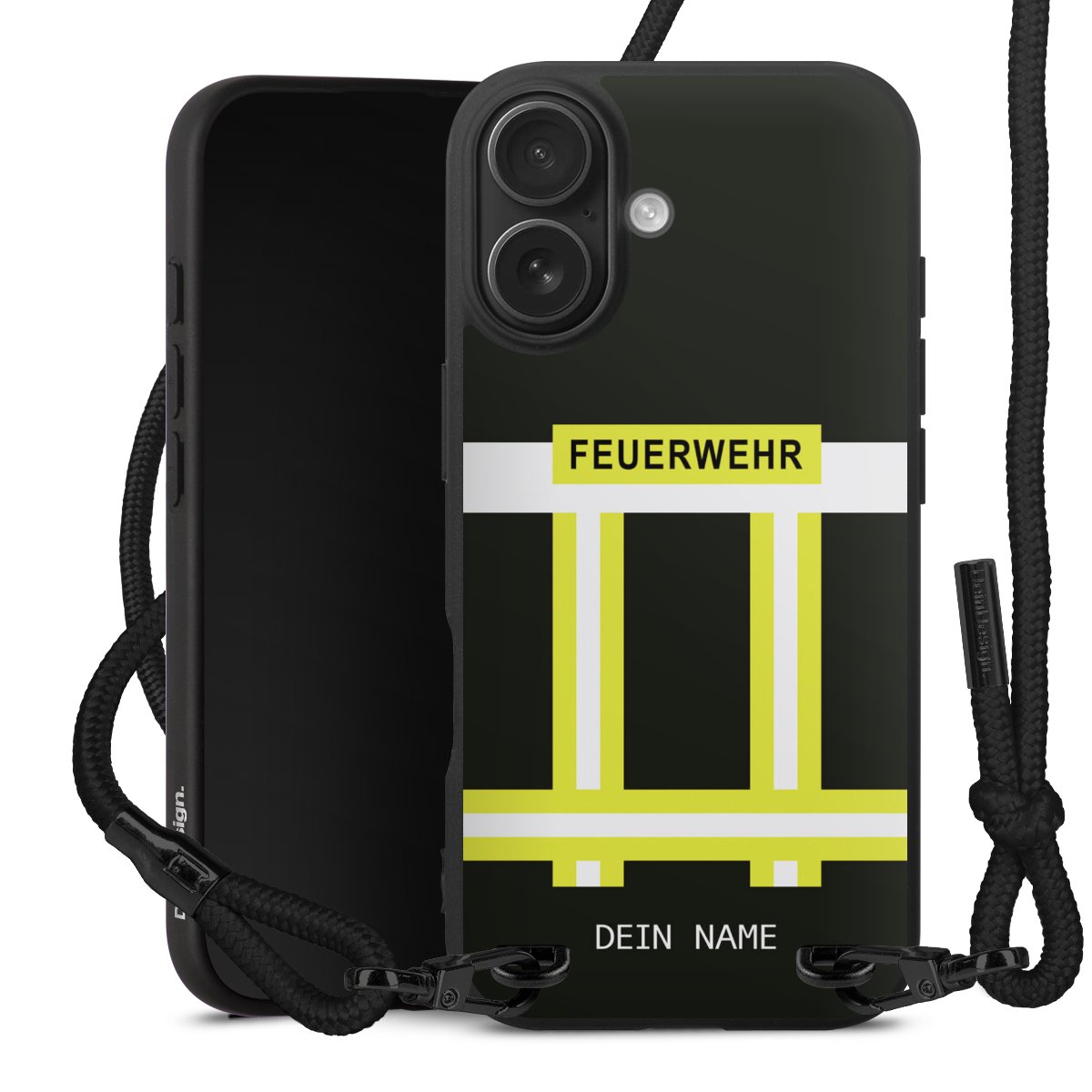 Pure Black: Handyhülle, Stoffband und Metalldetails in stylischem Mattschwarz.