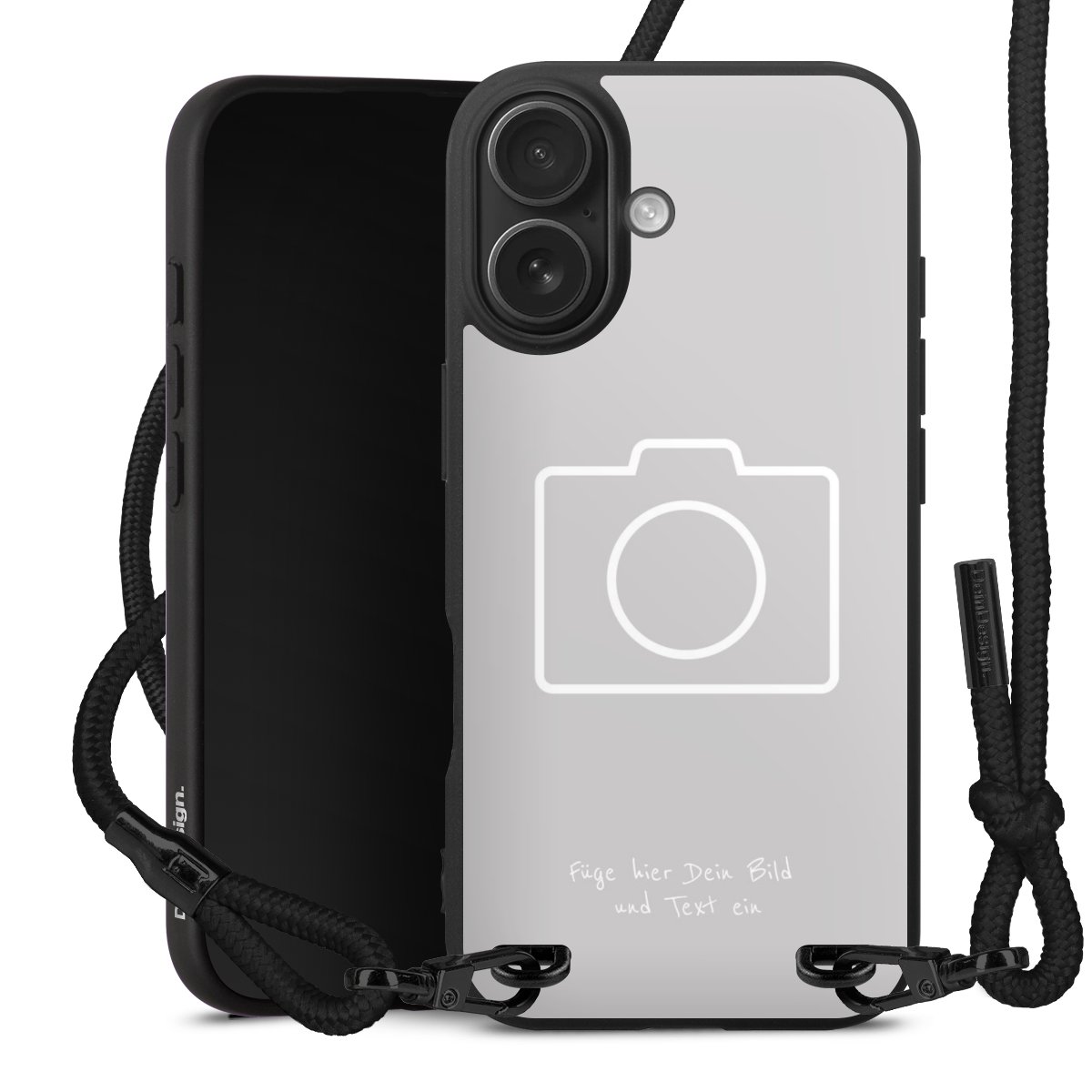 Pure Black: Handyhülle, Stoffband und Metalldetails in stylischem Mattschwarz.