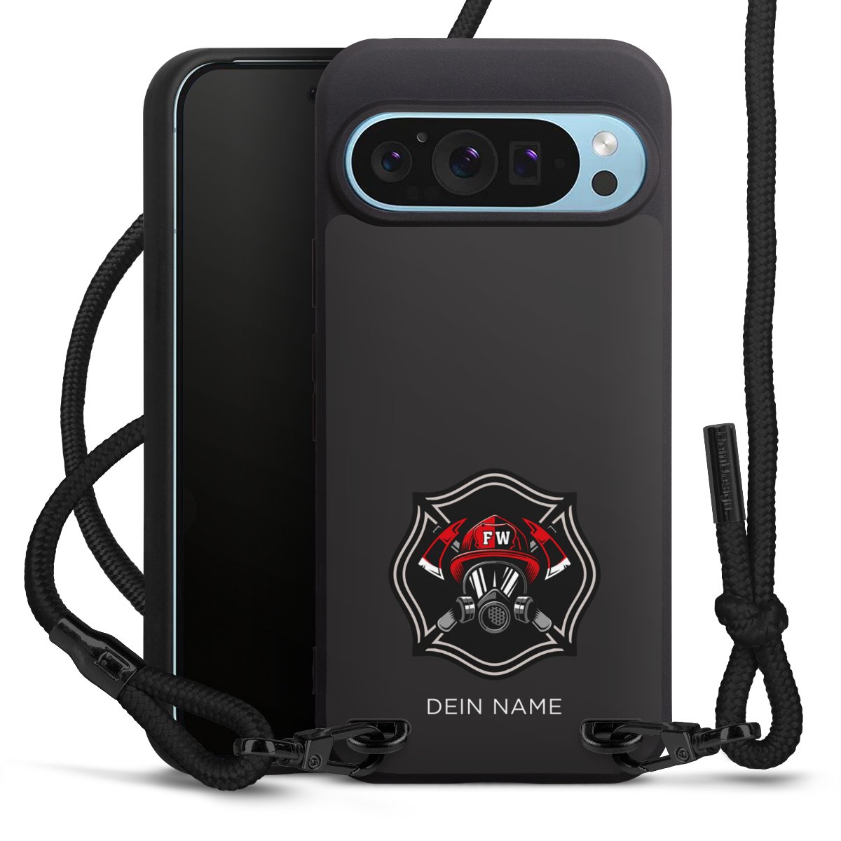 Pure Black: Handyhülle, Stoffband und Metalldetails in stylischem Mattschwarz.