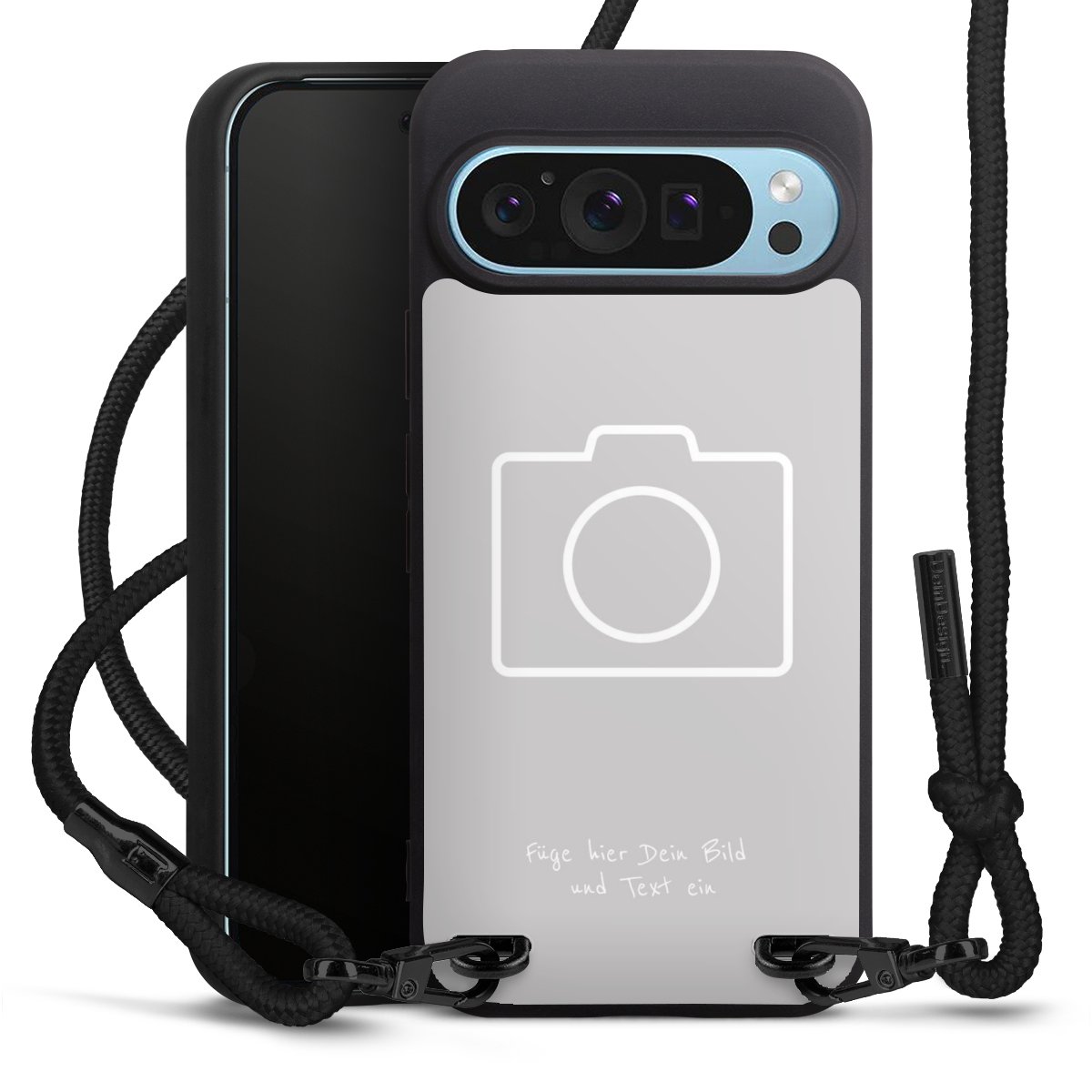 Pure Black: Handyhülle, Stoffband und Metalldetails in stylischem Mattschwarz.