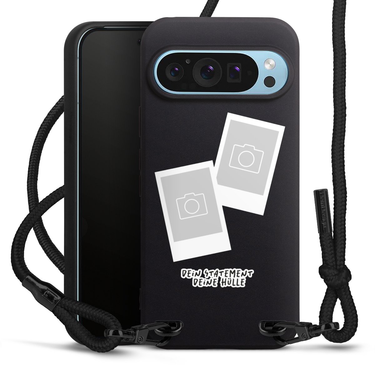 Pure Black: Handyhülle, Stoffband und Metalldetails in stylischem Mattschwarz.