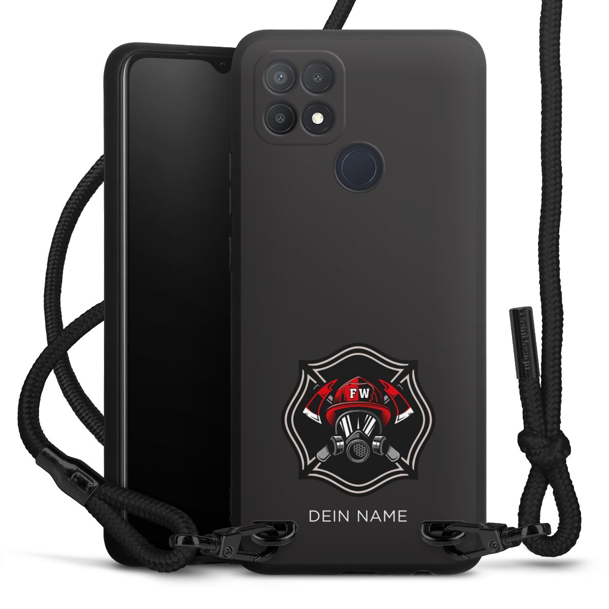 Pure Black: Handyhülle, Stoffband und Metalldetails in stylischem Mattschwarz.