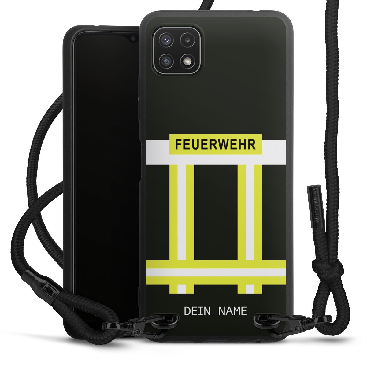 Pure Black: Handyhülle, Stoffband und Metalldetails in stylischem Mattschwarz.
