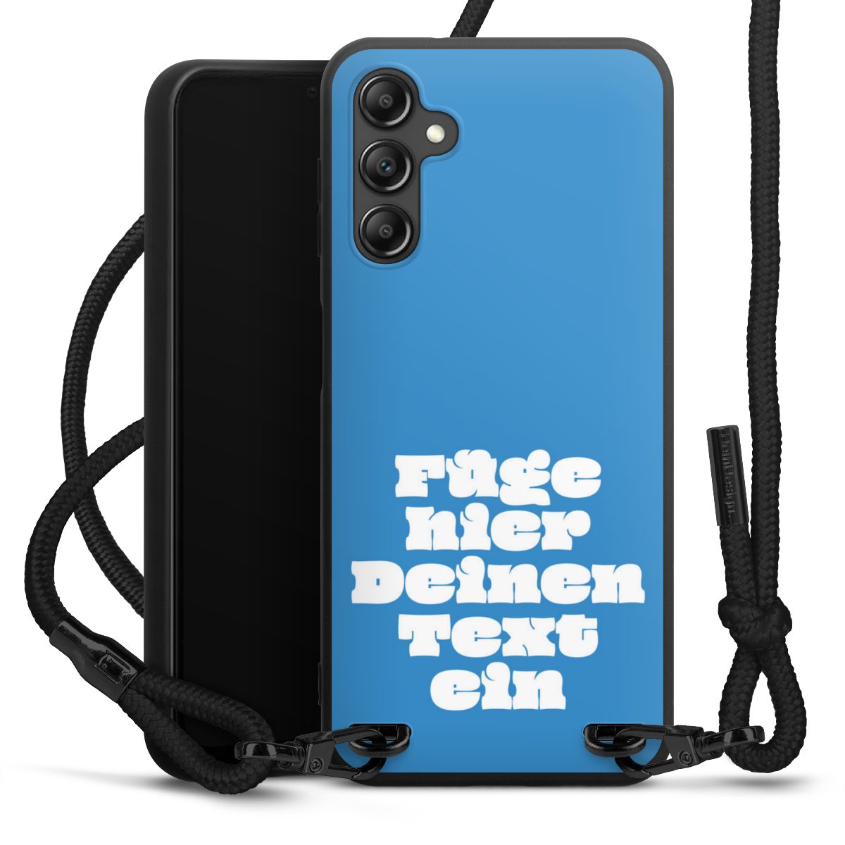 Pure Black: Handyhülle, Stoffband und Metalldetails in stylischem Mattschwarz.