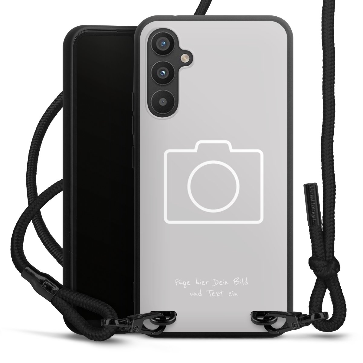 Pure Black: Handyhülle, Stoffband und Metalldetails in stylischem Mattschwarz.