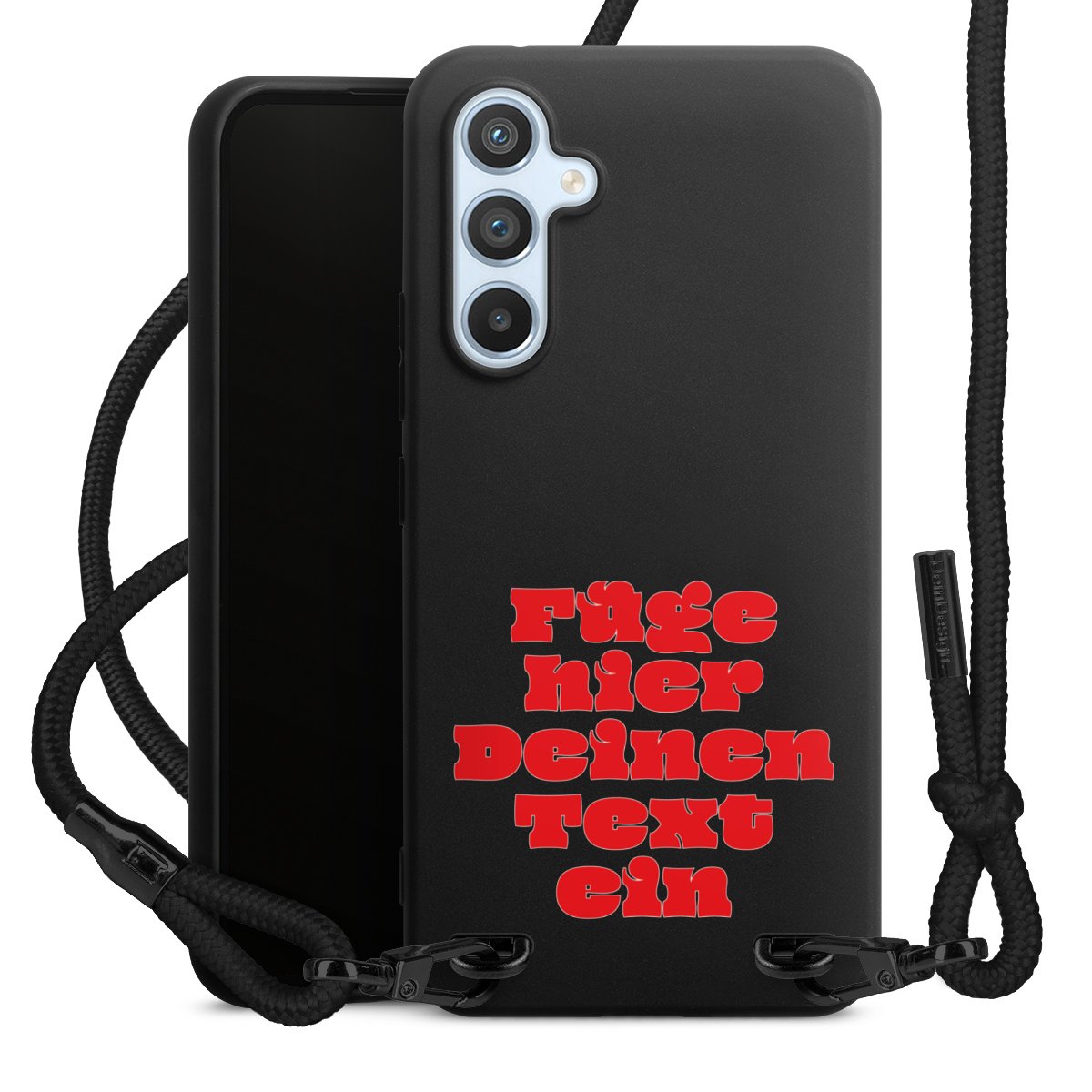 Pure Black: Handyhülle, Stoffband und Metalldetails in stylischem Mattschwarz.