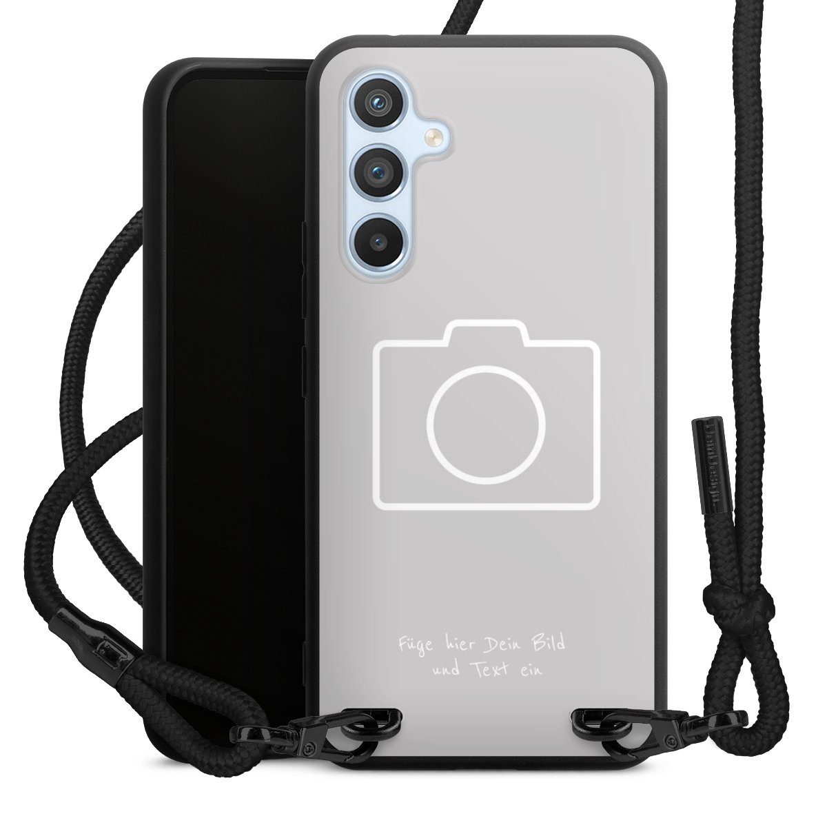 Pure Black: Handyhülle, Stoffband und Metalldetails in stylischem Mattschwarz.