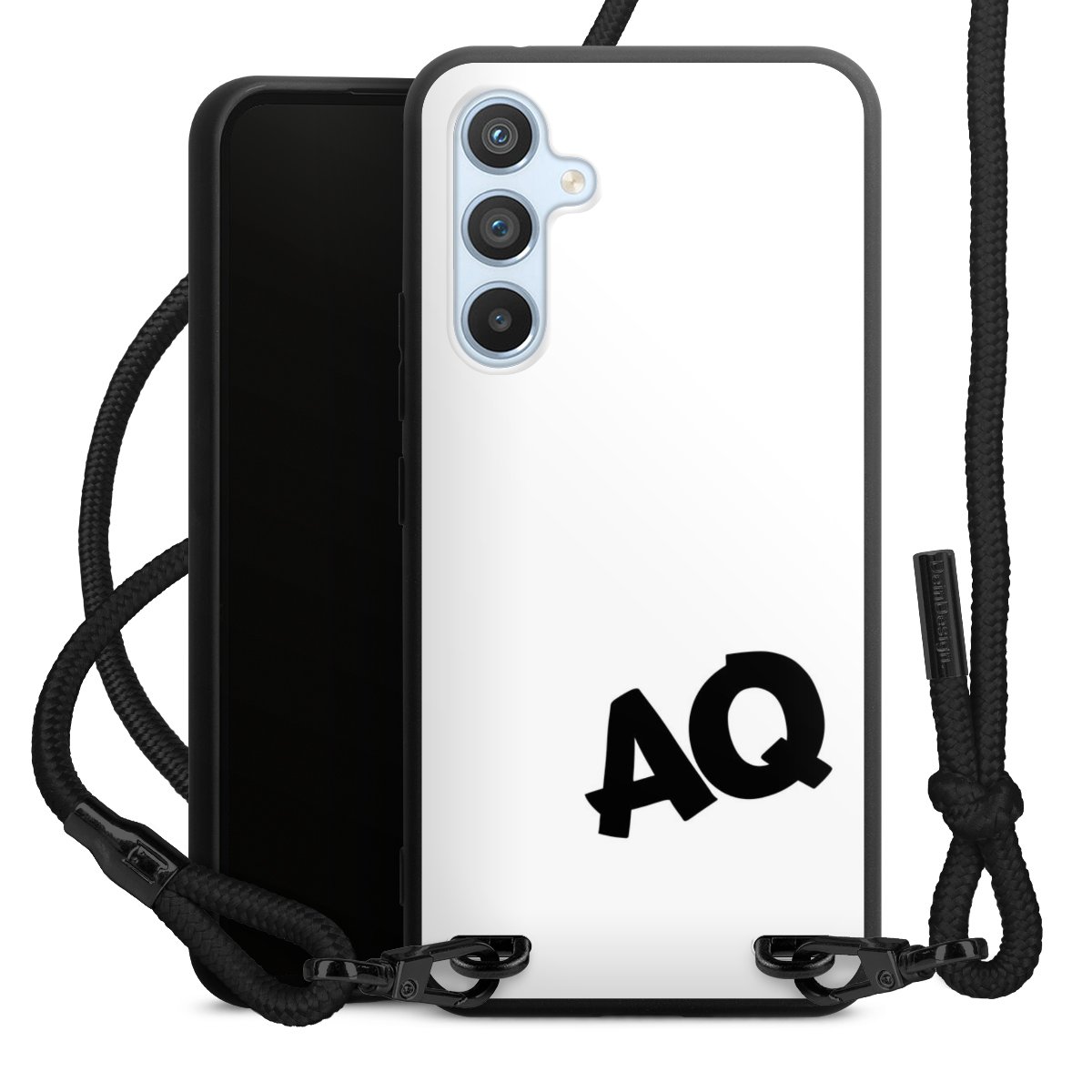 Pure Black: Handyhülle, Stoffband und Metalldetails in stylischem Mattschwarz.