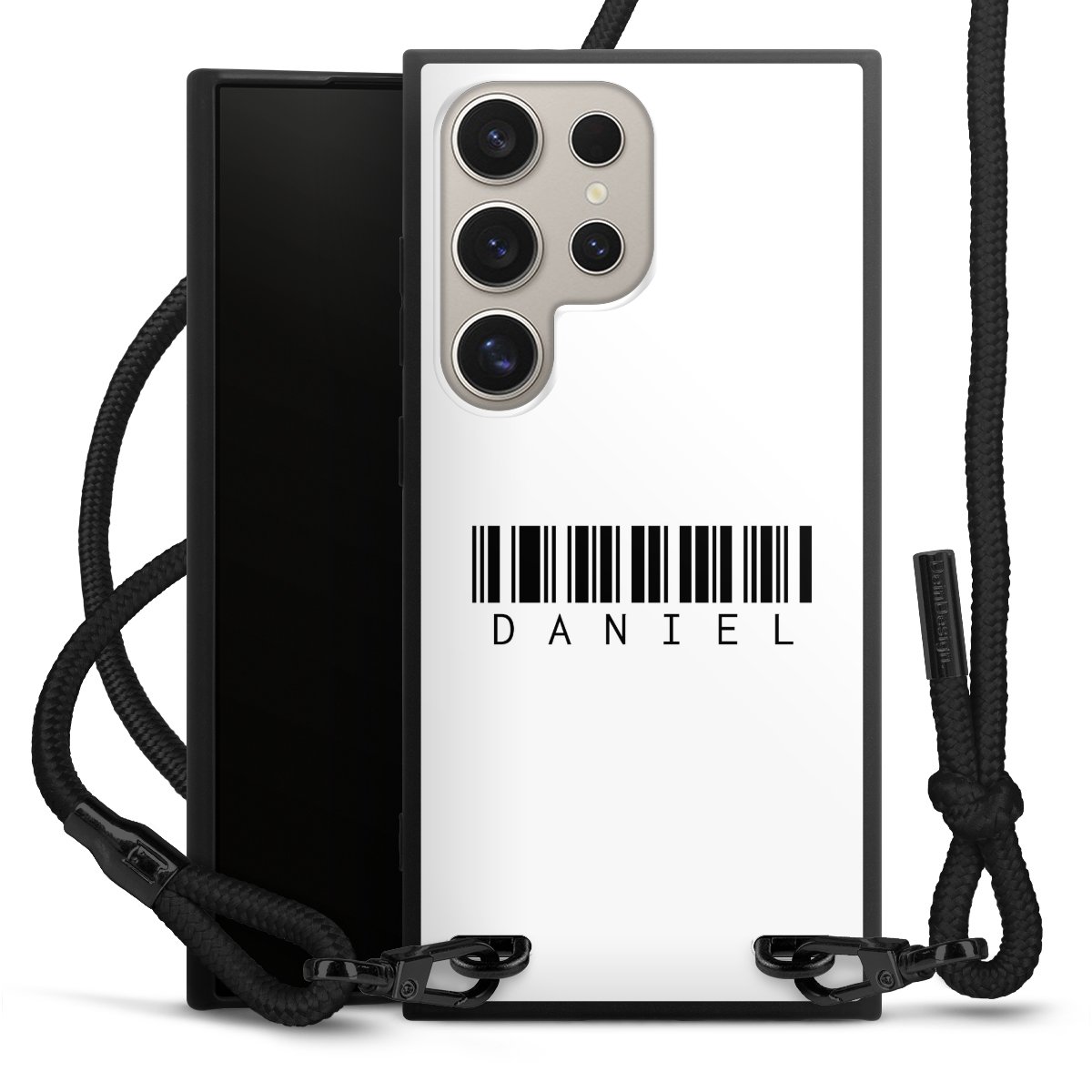 Pure Black: Handyhülle, Stoffband und Metalldetails in stylischem Mattschwarz.