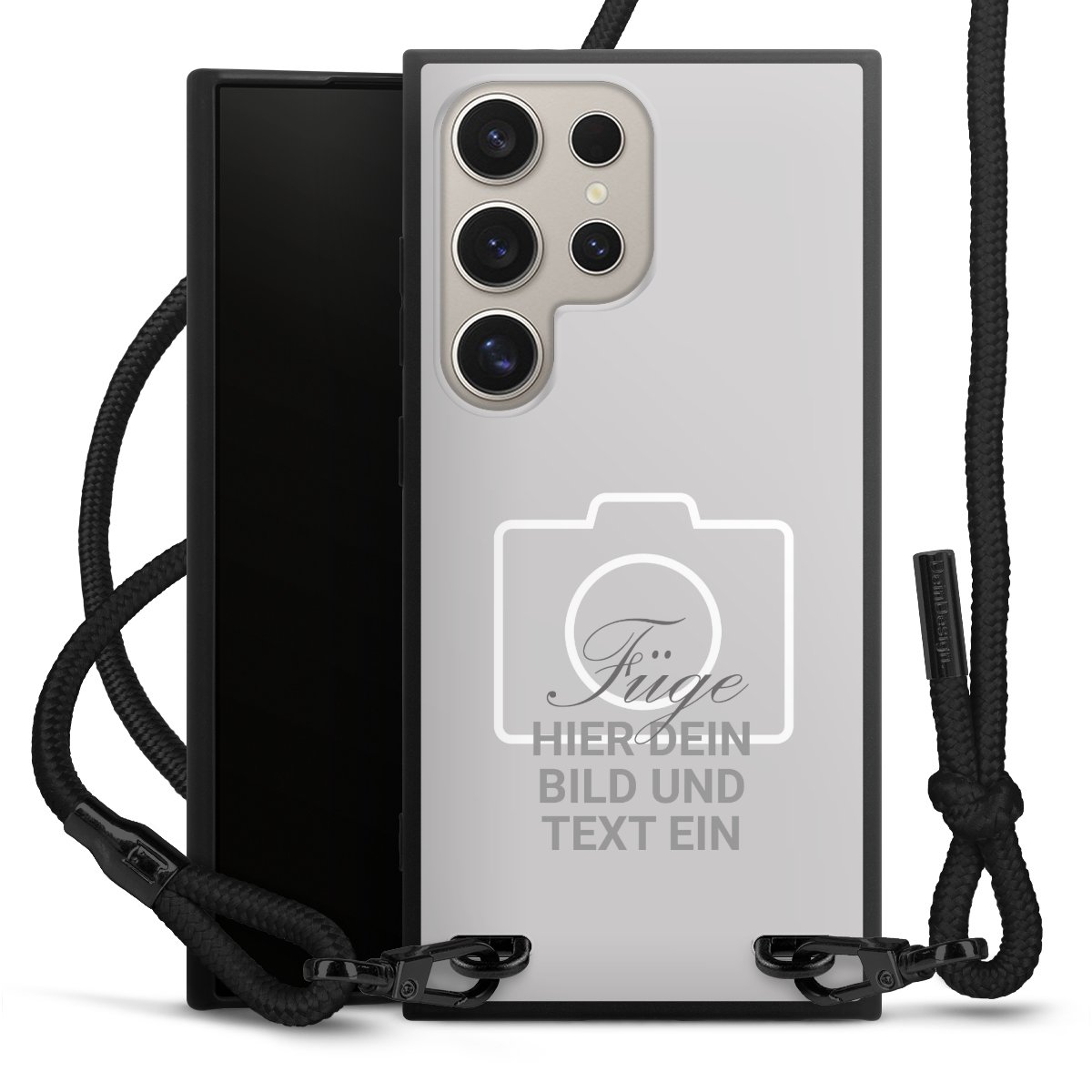 Pure Black: Handyhülle, Stoffband und Metalldetails in stylischem Mattschwarz.