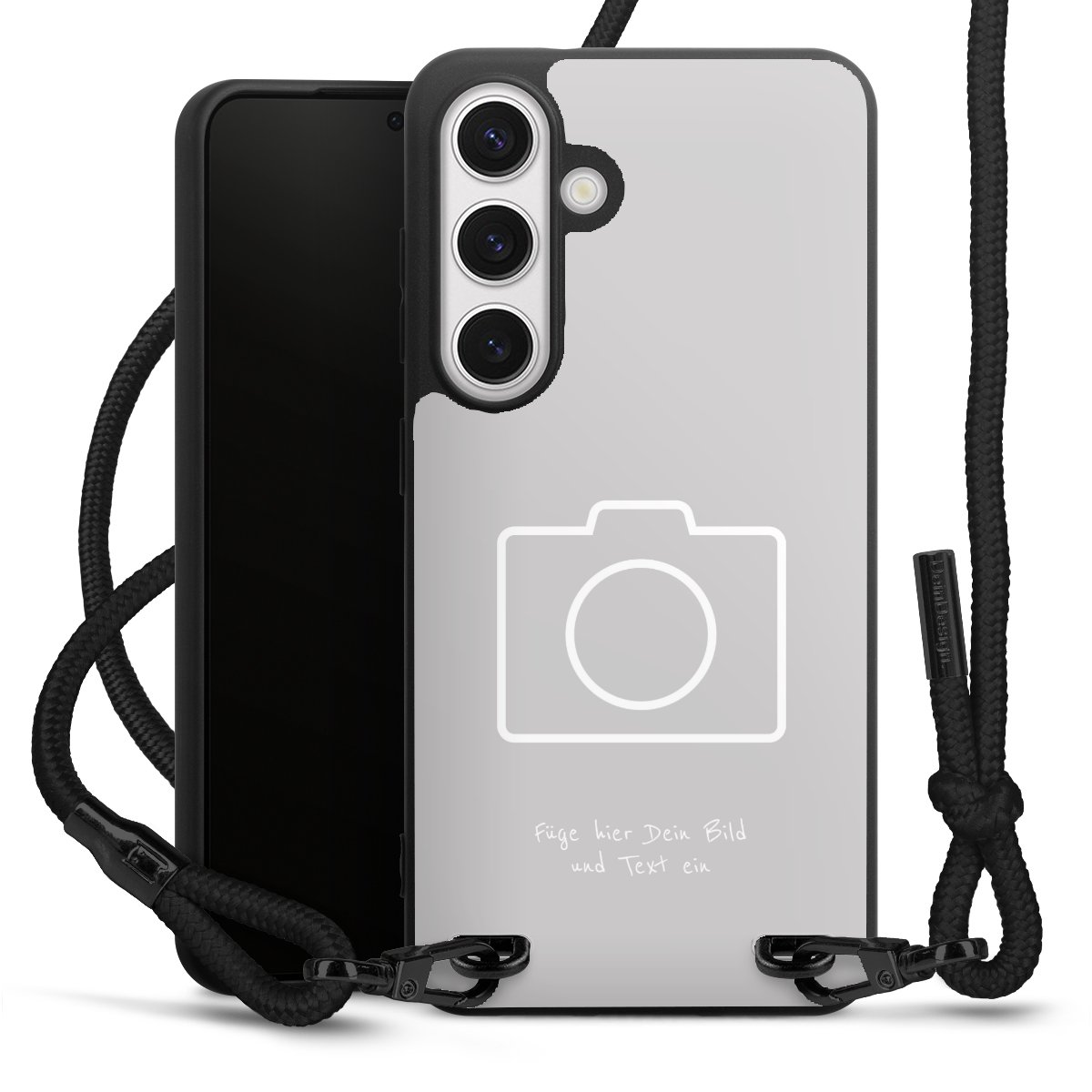 Pure Black: Handyhülle, Stoffband und Metalldetails in stylischem Mattschwarz.