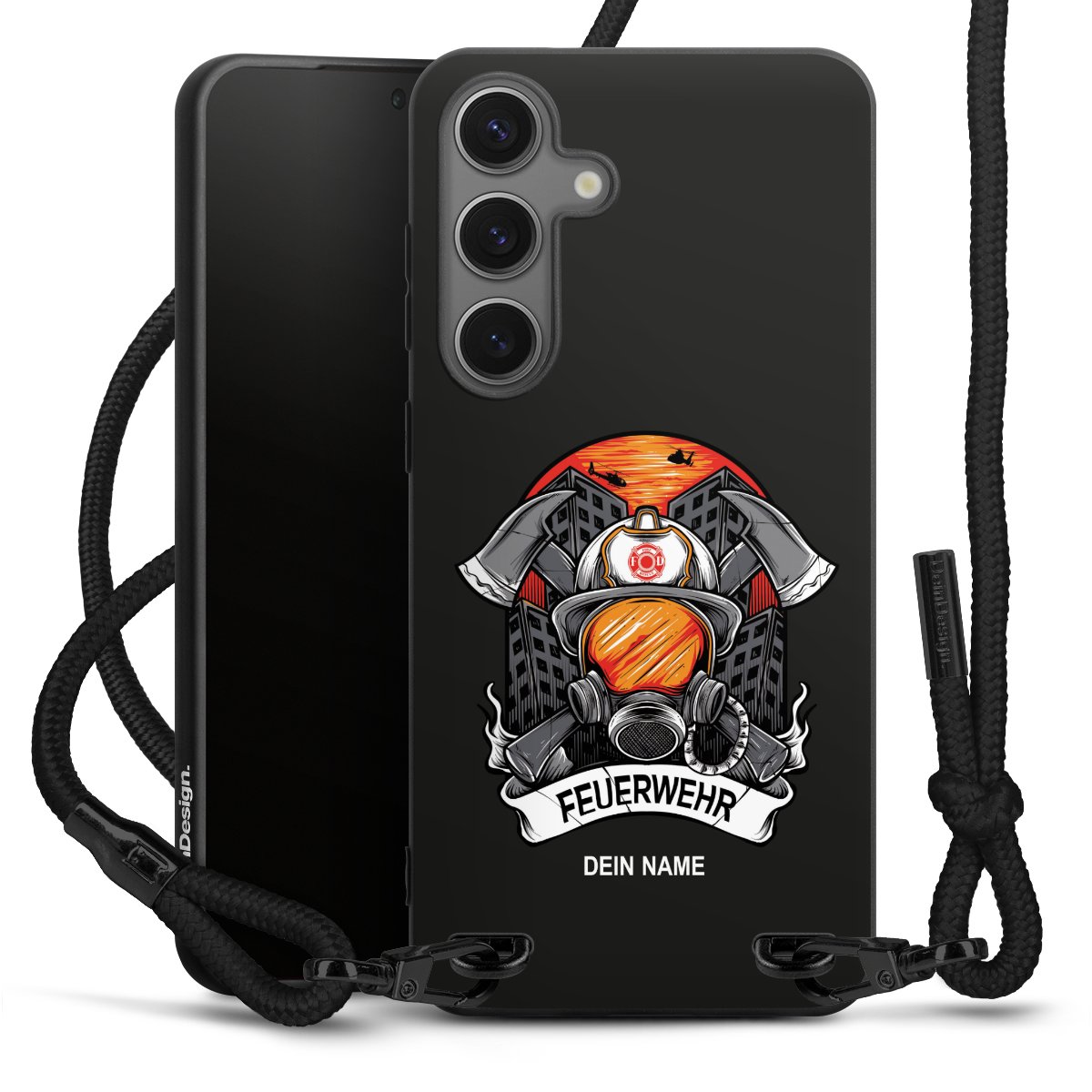 Pure Black: Handyhülle, Stoffband und Metalldetails in stylischem Mattschwarz.