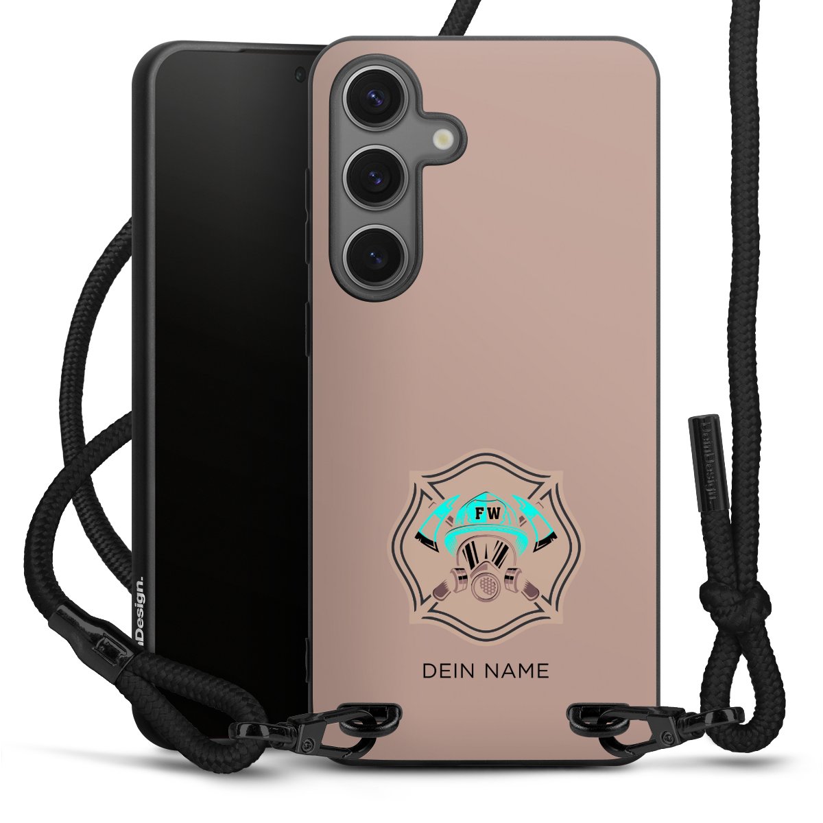 Pure Black: Handyhülle, Stoffband und Metalldetails in stylischem Mattschwarz.