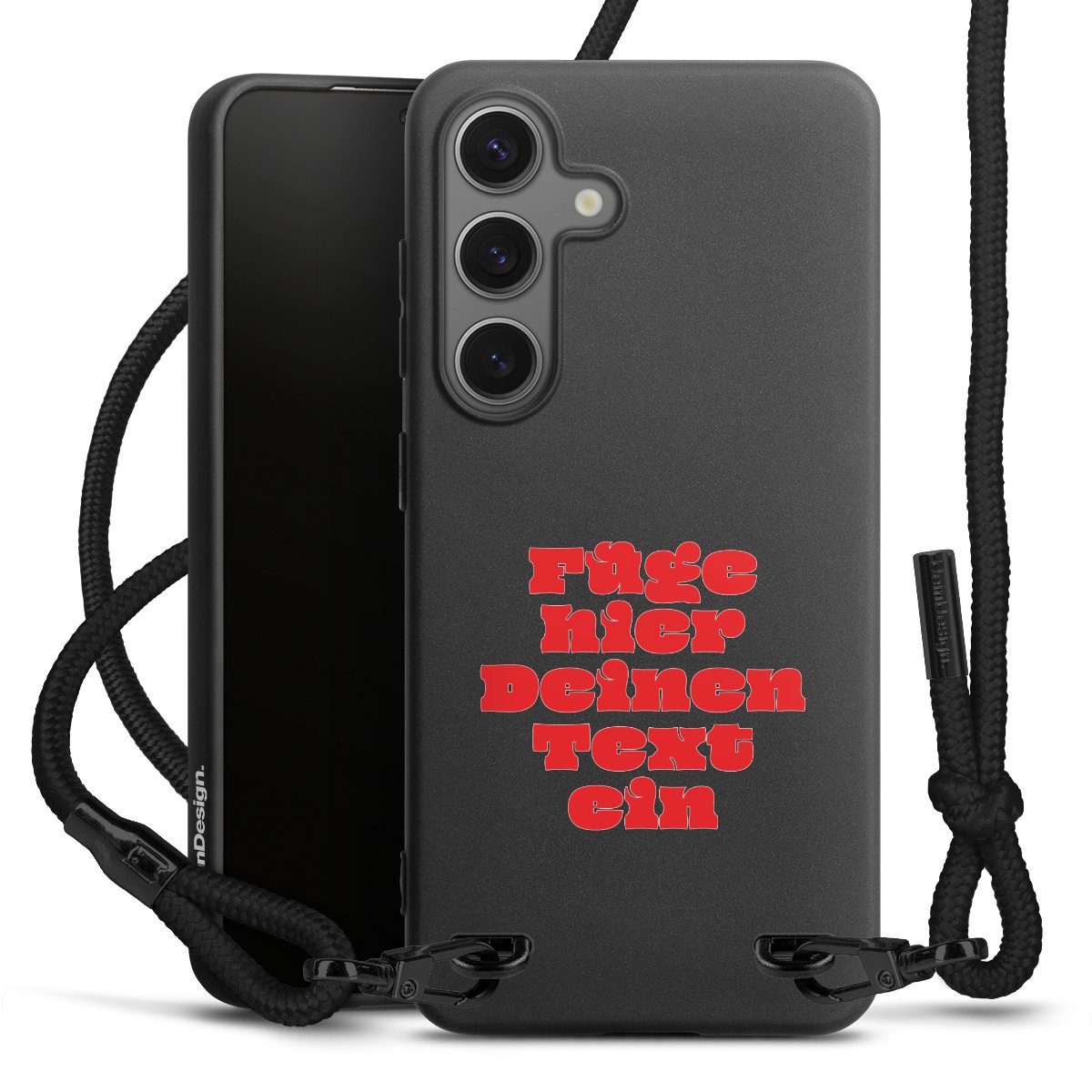 Pure Black: Handyhülle, Stoffband und Metalldetails in stylischem Mattschwarz.