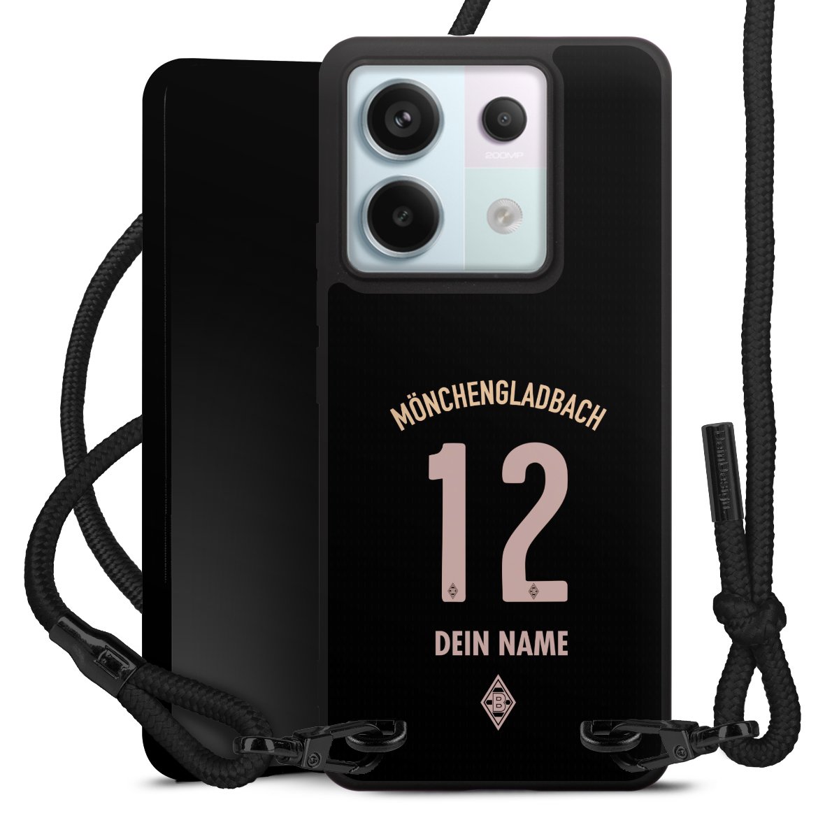 Pure Black: Handyhülle, Stoffband und Metalldetails in stylischem Mattschwarz.