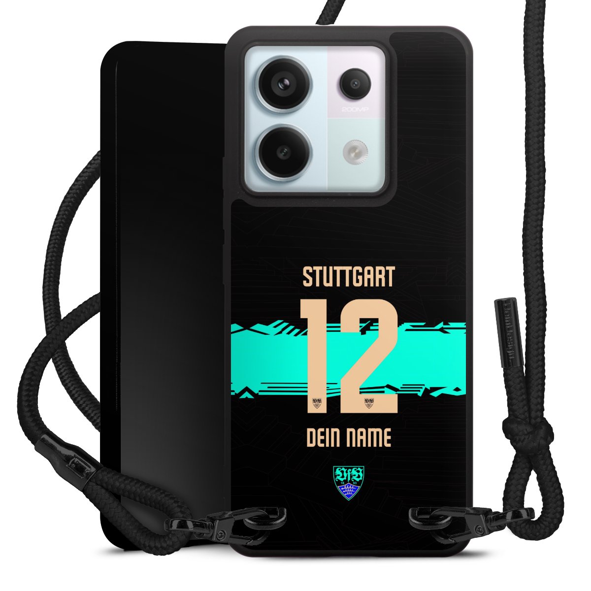 Pure Black: Handyhülle, Stoffband und Metalldetails in stylischem Mattschwarz.