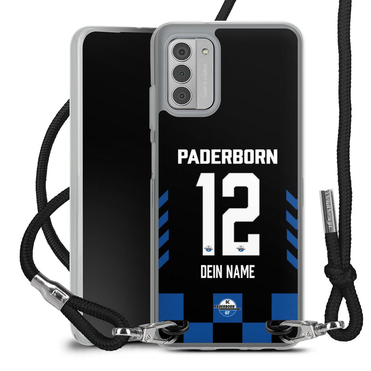 Habe Dein Handy, dank der flexiblen Silikon Handyhülle zum Umhängen mit der Handykette aus Stoff, immer griffbereit.