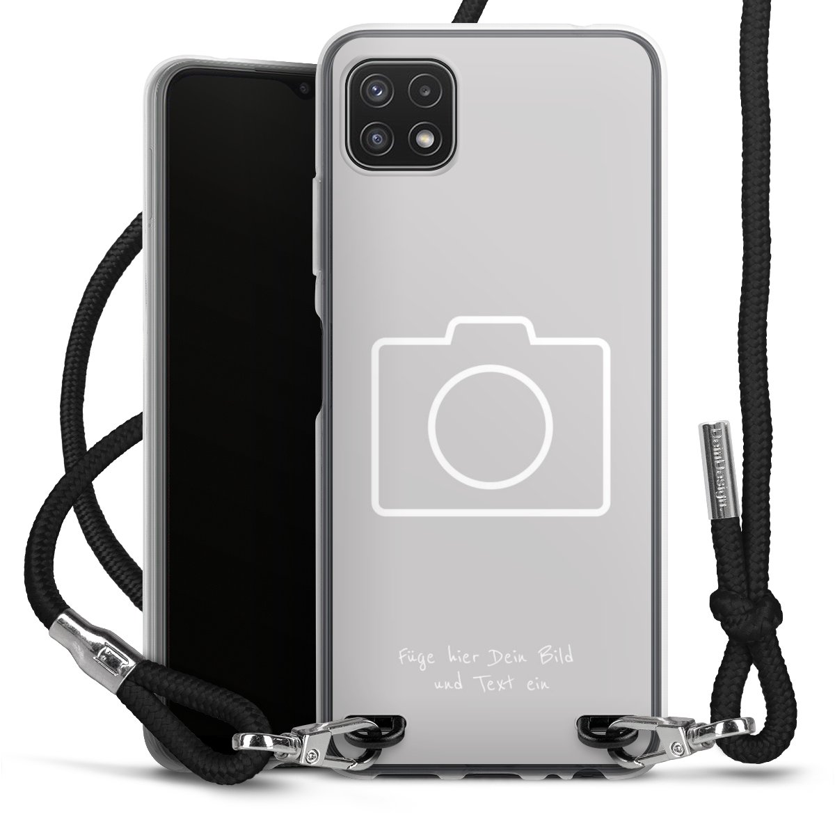 Bei dieser Handyhülle nutzen wir das solide Direktdruck-Verfahren, weshalb der Druckbereich ausschließlich die Rückseite umfasst und der Rand hingegen unbedruckt bleibt. Das Case zum Umhängen kann sowohl unbedruckt, als auch vollflächig oder partiell bedruckt bestellt werden. Wähle für Dein Design entweder eines unserer exklusiven Shop-Motive, oder werde kreativ und gestalte Dein Wunschdesign zum Beispiel mit Fotos und Overlays selbst. Designe Dir Dein persönliches Trend-Accessoire und setze ein individuelles Statement auf den Straßen!