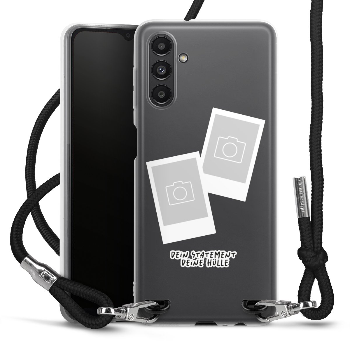 Bei dieser Handyhülle nutzen wir das solide Direktdruck-Verfahren, weshalb der Druckbereich ausschließlich die Rückseite umfasst und der Rand hingegen unbedruckt bleibt. Das Case zum Umhängen kann sowohl unbedruckt, als auch vollflächig oder partiell bedruckt bestellt werden. Wähle für Dein Design entweder eines unserer exklusiven Shop-Motive, oder werde kreativ und gestalte Dein Wunschdesign zum Beispiel mit Fotos und Overlays selbst. Designe Dir Dein persönliches Trend-Accessoire und setze ein individuelles Statement auf den Straßen!