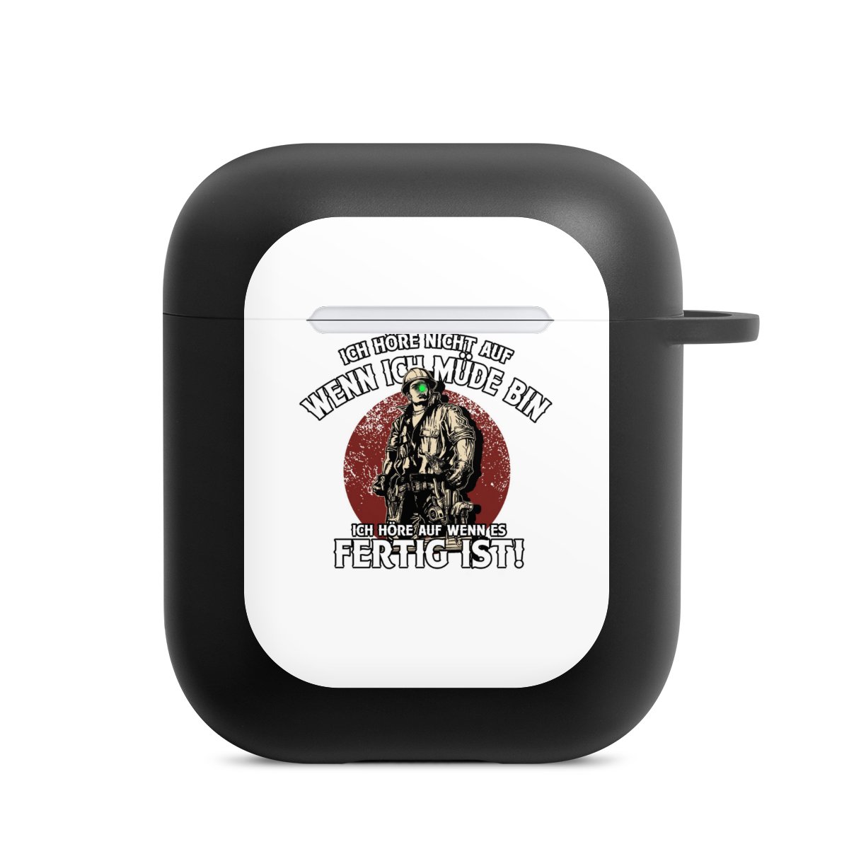 Das zweiteilige AirPods Case ermöglicht es Dir, Deine AirPods oder AirPods Pro sicher aufzubewahren und trotzdem immer griffbereit zu haben. Mit dem praktischen Karabinerhaken befestigst Du sie zum Beispiel ganz easy an Deiner Handykette oder einem Schlüsselbund. Wireless Charging bleibt natürlich weiterhin möglich. Die Hülle besteht aus hochwertigem TPU (thermoplastisches Polyurethan), einem langlebigen sowie bruchsicheren Material. Die Hülle ist in den Farben schwarz und weiß erhältlich. Und das Beste: Du kannst Dein AirPods Hülle selbst gestalten.