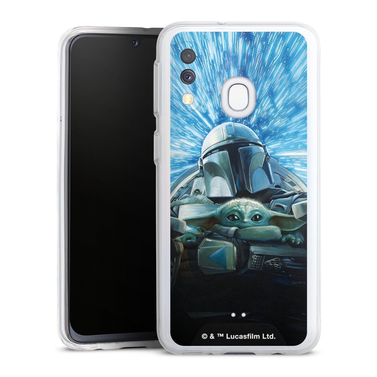 Grogu und Mando fliegen blau