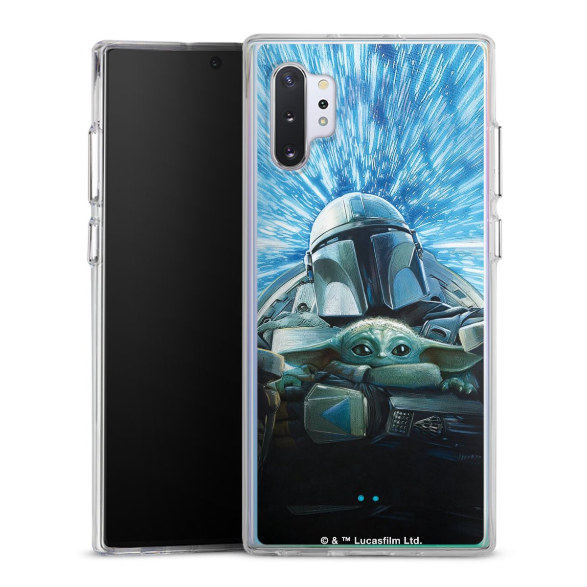 Grogu und Mando fliegen blau